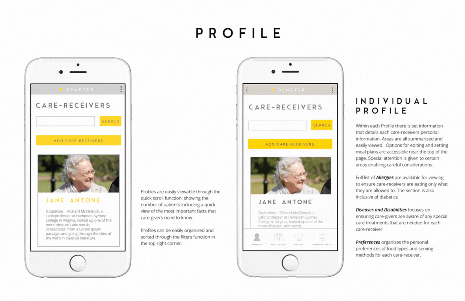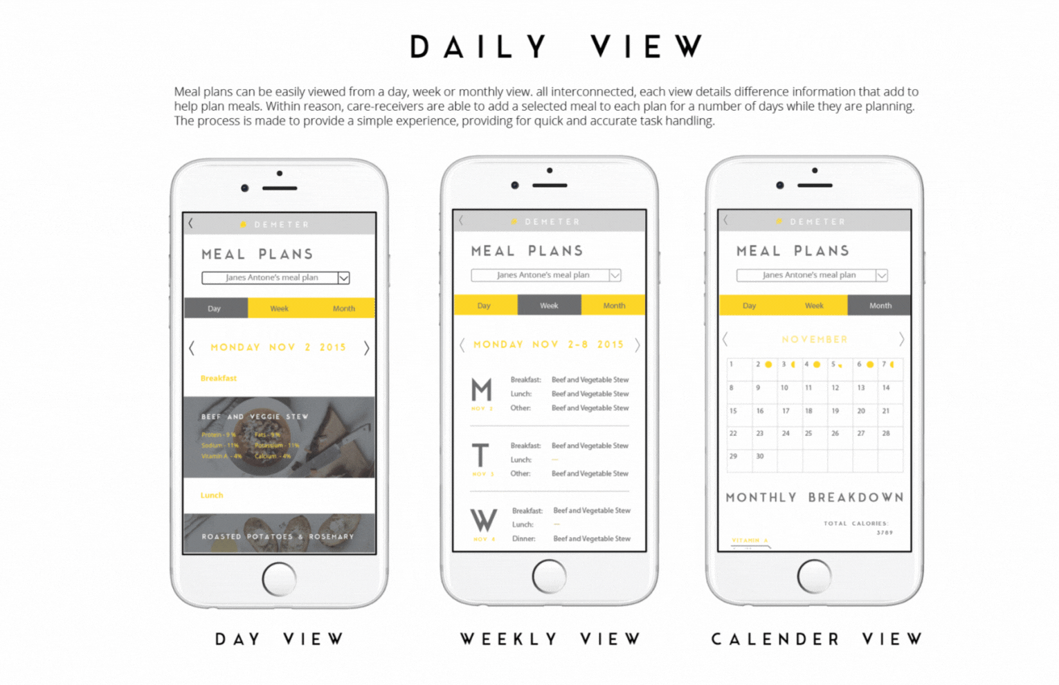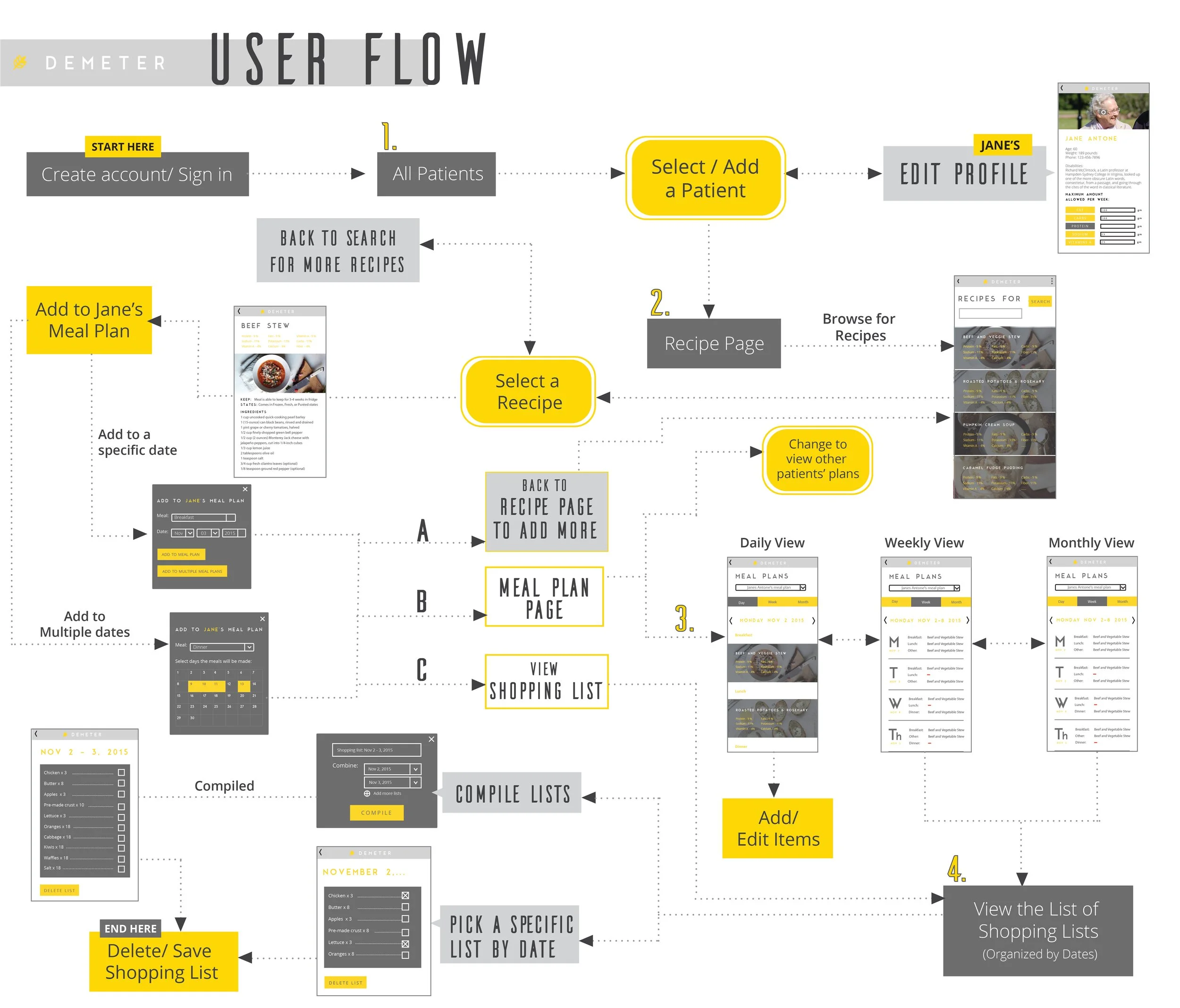 Demeter is a group project that was created me and 3 other teammates. The team was was inspired by the mother of one of the team members. Their work and dedication was a good insight on this line of work. We wanted to create something functional and useful to a community of people and make an impact. Our other source of inspiration was our united love of food, believing that every person has the right to enjoy delicious meals no matter what situation. My contributions to this project is user research to find out more about potential audience as well as the application flow and interaction. I also made a simple wireframe using Axure (you can try out first prototype here) to demonstrate the interactions in the app. Main features of the app includes recommending recipes based on selected care-receiver profiles, a simple view of meal plans and nutritional values with easy adjustable edits of selected meals, and automatically formulated shopping lists from meal plans allows for easy flow and planning.