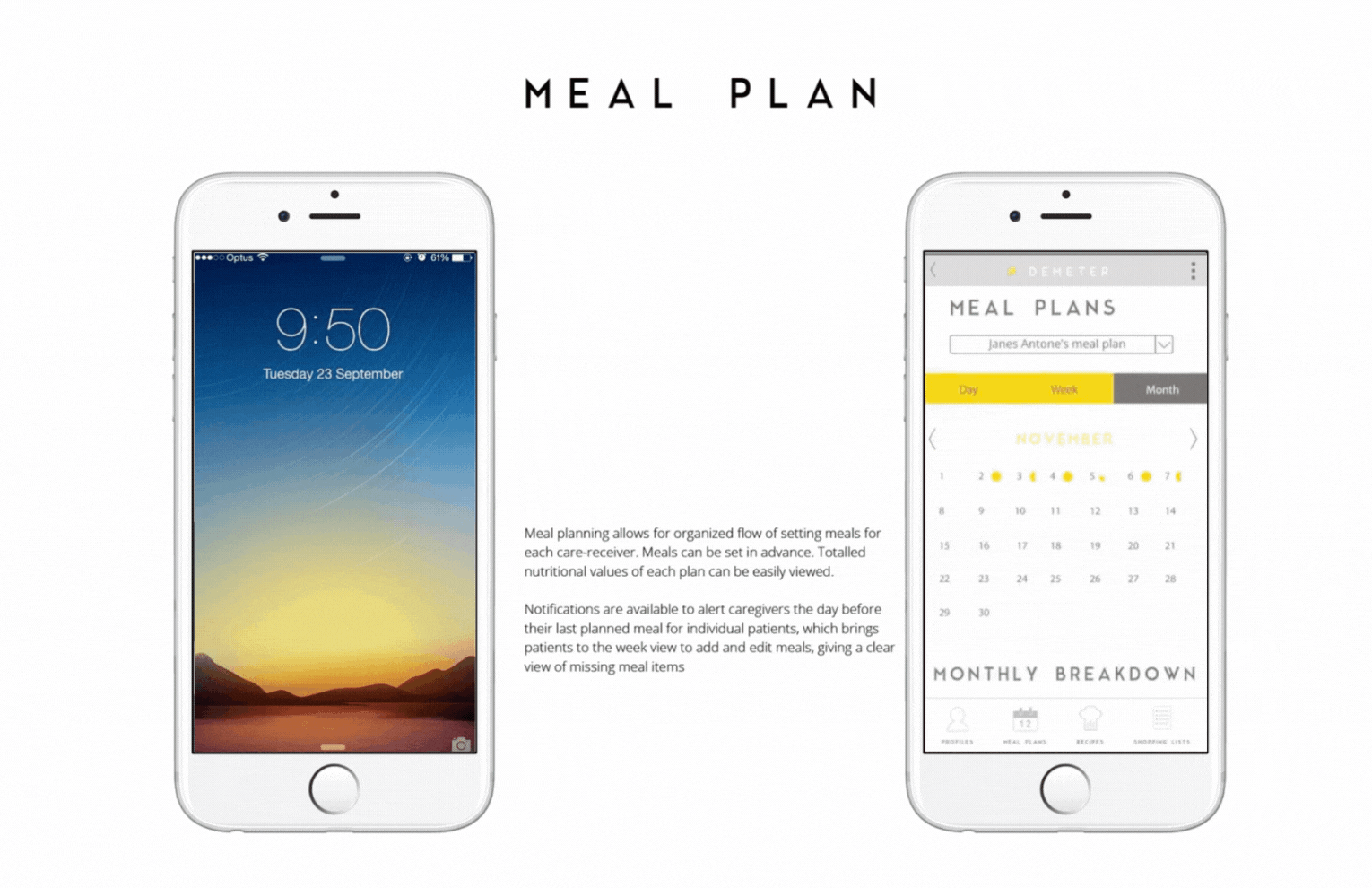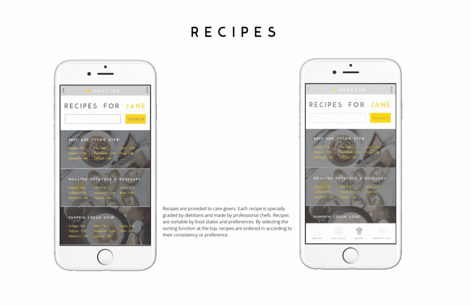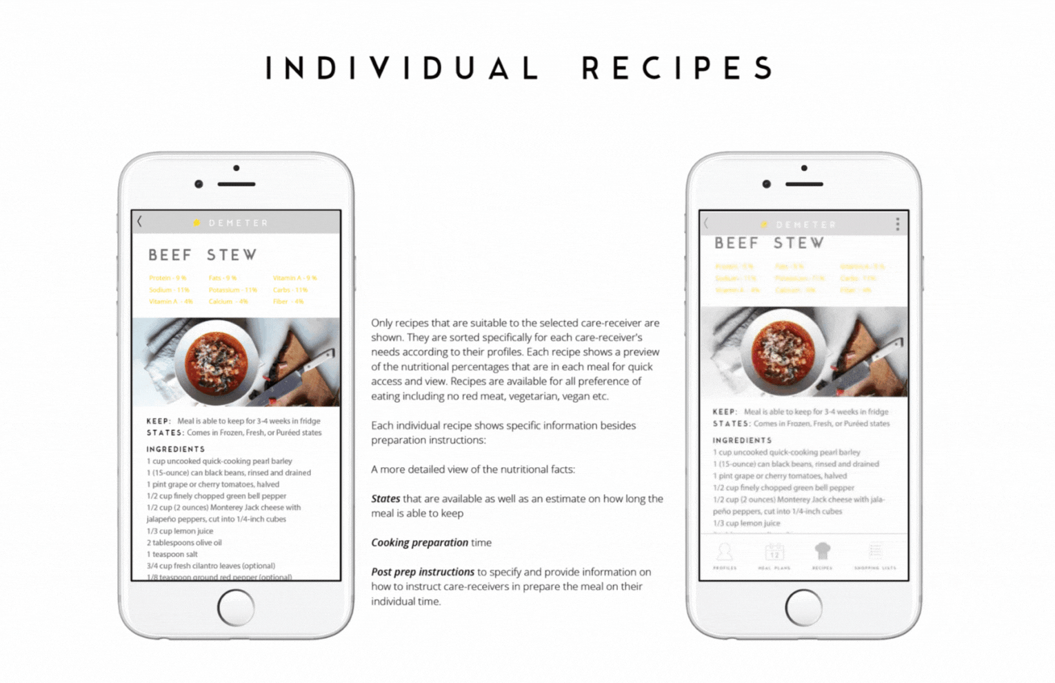 Caregivers are on the go, they need something convenient and portable. Something that can easily be accessed while they are shopping. or performing an assessment for a care-receiver. Mobiles devices are common and used everyday by volunteers and care-givers alike, eliminating accessibility as an issue. The application automatically pairs recipes to specific nutrition proles, helping care-givers prepare meals that are fit for their care-receivers. The application automatically pairs recipes to specific nutrition profiles, helping care-givers prepare meals that are fit for their care-receivers. It is aimed to show that meal planning can be quick and accurate, clear and concise